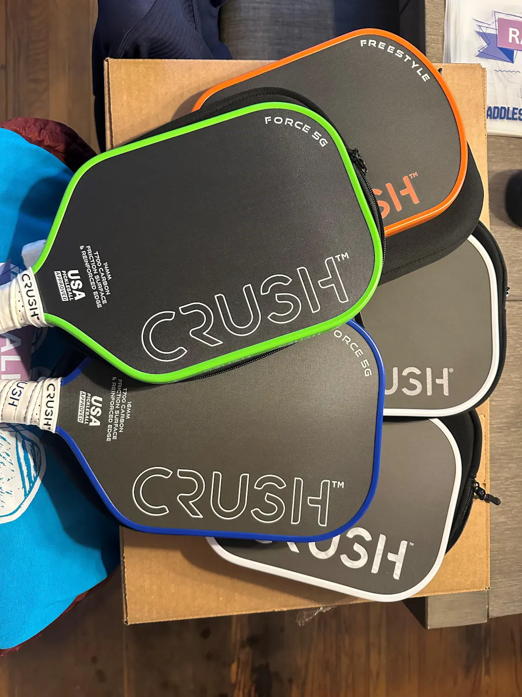 PRO Paddle Force 5G - available in both 14 mm (lime green) and 16 mm (blue). This paddle won't disappoint, and we challenge you to compare it to a like priced paddle on the market while giving you the same performance on the court.